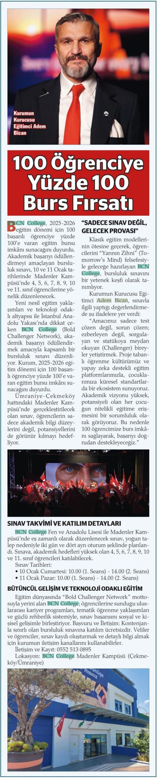 “BCN College, 2025-2026 eğitim dönemi için 100 başarılı öğrenciye yüzde 100’e varan eğitim bursu imkânı sunacağını duyurdu. Akademik başarıyı ödüllendirmeyi amaçlayan bursluluk sınavı, 10 ve 11 Ocak tarihlerinde Madenler Kampüsü’nde 4, 5, 6, 7, 8, 9, 10 ve 11. sınıf öğrencilerine yönelik düzenlenecek.”